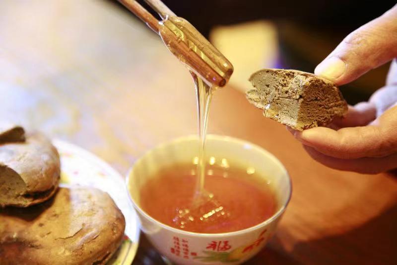 彝族群众喜欢养蜜蜂,也善于养蜂,他们利用山高林深、野花遍地的有利条件来养蜂,一年四季都可采收蜂蜜。蜂蜜数冬蜜最好,其营养价值和药用价值都很高。掰一块苦荞粑粑,再蘸点冬蜜,冬蜜在粑粑上化开,赶紧咬上一口,舌尖瞬时香甜异常,细心咀嚼,味蕾深处便是浓浓的彝乡味道。